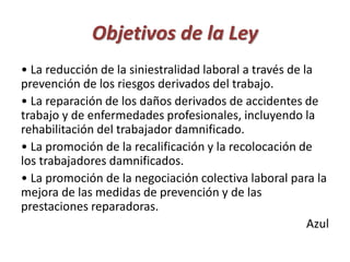 La Ley de Riesgo de Trabajo tiene como objetivos principales la reducción de accidentes laborales a través de la prevención de riesgos, la reparación de daños derivados de accidentes y enfermedades profesionales, y la promoción de la recalificación de trabajadores damnificados. Establece los derechos, deberes y prohibiciones de trabajadores, empleadores y aseguradoras, y define conceptos como accidente de trabajo, enfermedad profesional e incapacidades derivadas.