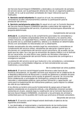 La Ley de Servicio Social Integral de Venezuela tiene como objetivo definir, organizar, promover y regular el servicio social integral en el país. Establece que el servicio social integral consiste en actividades individuales y colectivas de los ciudadanos destinadas al desarrollo comunitario y la mejora de la calidad de vida. Todos los venezolanos entre 18 y 60 años deben cumplir con el servicio social de acuerdo a sus capacidades. Se crea la Comisión Nacional del Servicio Social Integral (CONASESI) encargada de regular y promover las políticas de servicio social