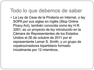 La Ley S.O.P.A. extiende los poderes del Departamento de Justicia de EE.UU. y amplía las capacidades de los propietarios de derechos intelectuales para combatir la piratería en línea de contenidos protegidos como música, películas, libros y productos falsificados. El proyecto de ley fue presentado en 2011 y se asemeja a leyes anteriores como el Acta PRO-IP de 2008.