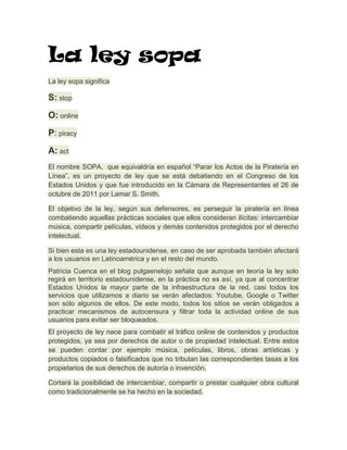 Este documento resume un ensayo sobre la ley SOPA (Stop Online Piracy Act) que se está debatiendo en el Congreso de Estados Unidos. La ley SOPA tiene como objetivo combatir la piratería en línea bloqueando sitios web que alberguen contenido con derechos de autor. Si se aprueba, la ley afectaría a usuarios de todo el mundo al obligar a sitios como YouTube y Google a practicar la censura. Algunas ventajas mencionadas son la protección de derechos de autor, pero también traería desventajas como