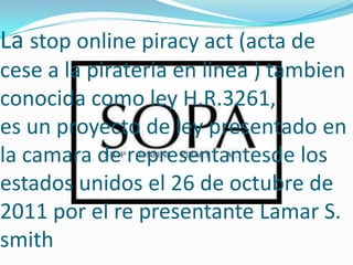 La ley SOPA (Stop Online Piracy Act) fue introducida en octubre de 2011 para combatir la piratería online. El 18 de enero de 2012, Wikipedia y otros 7000 sitios realizaron una protesta apagando sus servicios para oponerse a la ley SOPA, la cual amenazaba la libertad de expresión, podría dañar software de código abierto y la seguridad de Internet, e invadir la privacidad con inspección profunda de paquetes.