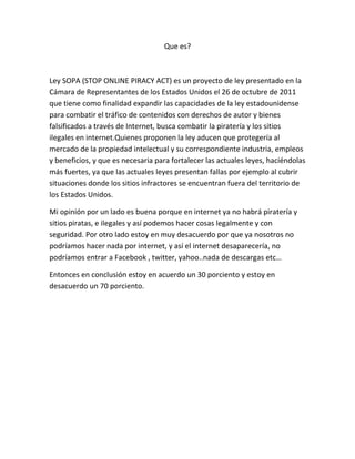 La Ley SOPA (STOP Online Piracy Act) es un proyecto de ley estadounidense que busca expandir las capacidades legales para combatir la piratería y sitios ilegales en Internet. Aunque protegería la propiedad intelectual y empleos, también restringiría demasiado el acceso a sitios web y plataformas populares como redes sociales y descargas. Por lo tanto, el autor está mayormente en desacuerdo con la ley a pesar de reconocer sus objetivos de frenar la piratería en línea.