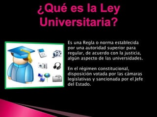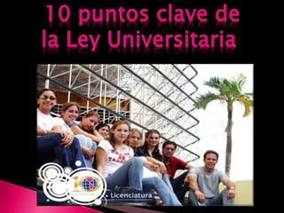 La ley universitaria propone la creación de una Superintendencia Universitaria (Sunau) que supervisará la calidad educativa y uso de recursos de las universidades. Algunos puntos claves son que la acreditación de carreras será obligatoria, carreras no acreditadas podrían ser cerradas, y se requerirá tesis y dominio de idioma extranjero para obtener grados de bachiller y licenciatura. El proyecto también establece estándares como estudios generales obligatorios y actualización de planes de estudio.