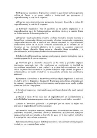 La ley 1014 de 2006 tiene como objetivo promover la cultura del emprendimiento en Colombia a través de tres oraciones. Primero, establece un marco institucional que incluye la creación de Redes Nacionales y Regionales para el Emprendimiento para coordinar las iniciativas entre el gobierno y el sector privado. Segundo, busca fomentar el espíritu emprendedor en el sistema educativo a través de una cátedra transversal de emprendimiento. Tercero, define mecanismos como planes de negocios y financiamiento para apoyar el des