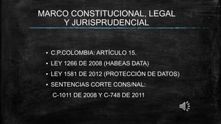 El documento presenta el marco legal y jurisprudencial para la protección de datos personales en Colombia, incluyendo la Constitución, leyes y sentencias. Define datos personales y establece principios como legalidad, finalidad y libertad para el tratamiento de datos. Explica que la protección aplica a datos registrados pública o privadamente y categoriza datos sensibles que requieren mayores salvaguardias.