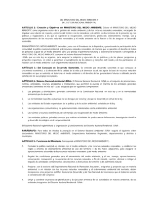 Este documento establece la Ley 99 de 1993 en Colombia, la cual crea el Ministerio del Medio Ambiente. El Ministerio será el organismo rector encargado de formular las políticas ambientales y de recursos naturales del país para garantizar el desarrollo sostenible. Además, la ley organiza el Sistema Nacional Ambiental que coordinará el Ministerio y estará integrado por principios, normas, instituciones y recursos para la gestión ambiental de manera descentralizada, democrática y participativa.