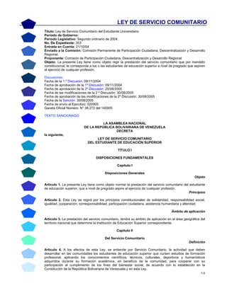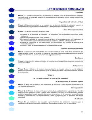Este documento establece la Ley de Servicio Comunitario del Estudiante Universitario en Venezuela. La ley requiere que los estudiantes universitarios completen al menos 120 horas de servicio comunitario como requisito para graduarse. El servicio comunitario busca promover la solidaridad de los estudiantes con la comunidad y aplicar sus conocimientos para beneficiar a la sociedad. La ley define los roles y responsabilidades de las instituciones educativas y los estudiantes para la implementación del servicio comunitario.