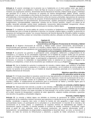 Este documento presenta la Ley del Régimen Prestacional de Vivienda y Hábitat de Venezuela. La ley establece el derecho a la vivienda y hábitat dignos como un servicio público no lucrativo y crea un Sistema Nacional de Vivienda y Hábitat para garantizar este derecho de manera descentralizada. Además, la ley promueve la participación comunitaria y establece objetivos como aumentar la producción de vivienda, fomentar el empleo en el sector de la construcción, y mejorar la eficiencia del Estado