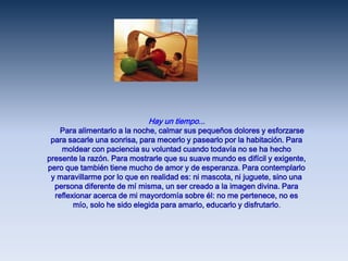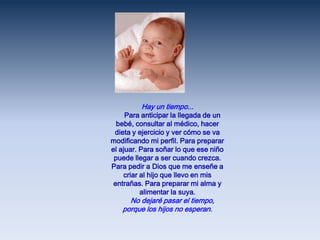Este documento describe las diferentes etapas y responsabilidades de ser madre, desde la preparación para la llegada del bebé, pasando por su crianza y educación temprana, hasta dejarlo ir para que emprenda su propio camino en la vida. Enfatiza la importancia de aprovechar cada momento y etapa porque "los hijos no esperan" y el tiempo con ellos es breve.