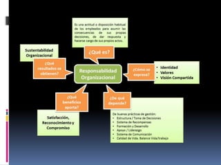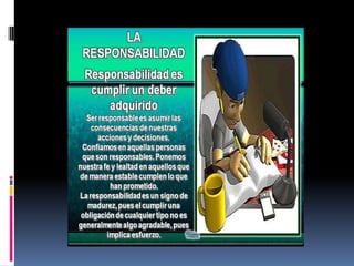 El documento presenta tres historias que ilustran la importancia de la responsabilidad. La primera historia describe a un estudiante que completó un trabajo en grupo mientras que sus compañeros no lo hicieron. La segunda historia enfatiza que uno debe completar sus tareas antes de otras actividades para tener éxito. La tercera historia es una fábula sobre un jardinero que explica que el esfuerzo puesto en una tarea determina los resultados obtenidos.