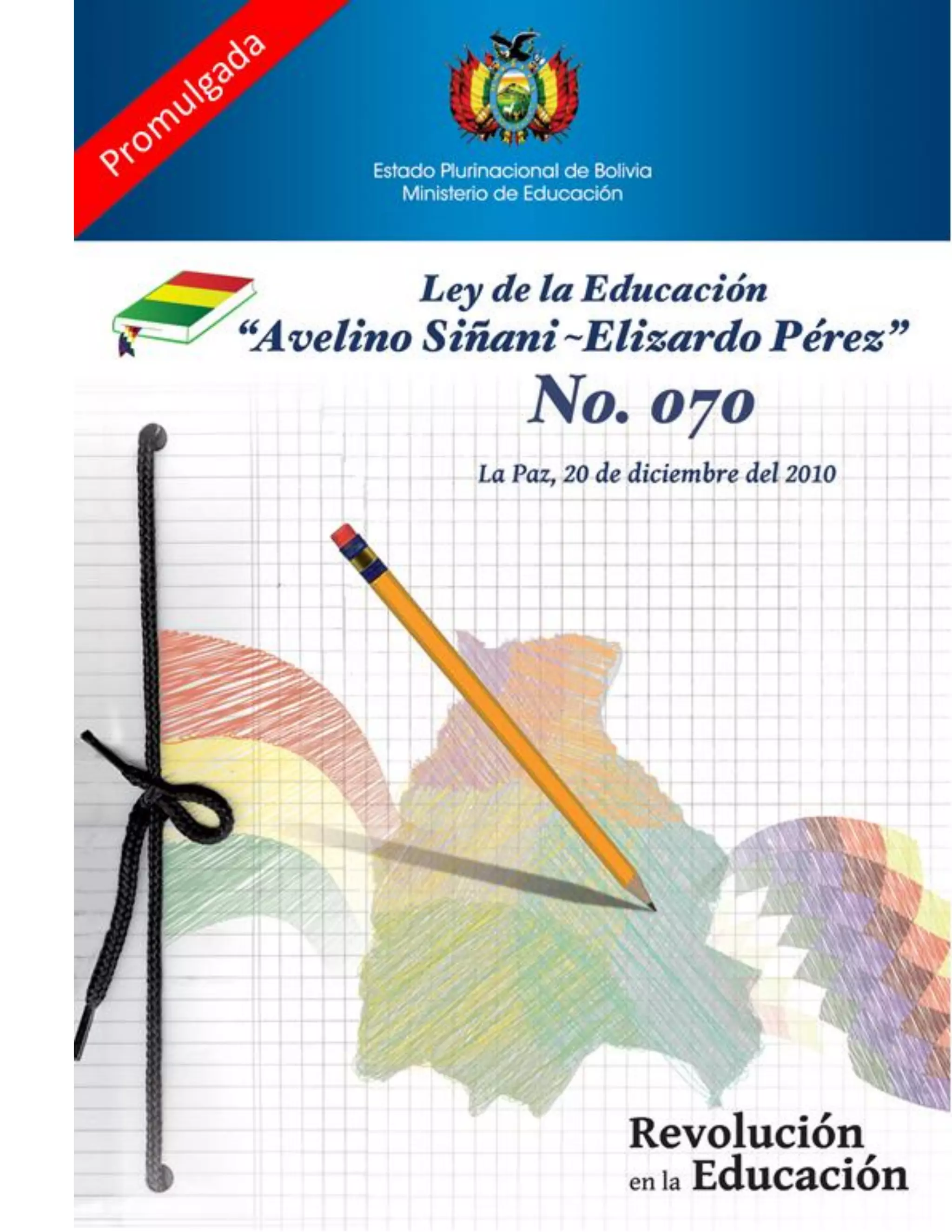 Este documento establece la Ley de Educación de Bolivia. Define la educación como un derecho fundamental y responsabilidad del Estado. Establece los principios de una educación intercultural, comunitaria y descolonizada, orientada al desarrollo integral de las personas. Sus objetivos incluyen formar a los estudiantes de manera holística y equitativa, universalizar los conocimientos culturales propios, y fortalecer la identidad cultural de los pueblos indígenas.