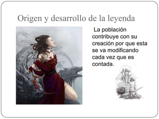 El documento describe el origen y desarrollo de las leyendas. Las leyendas se van modificando cada vez que son contadas debido a las contribuciones de la población. También tienden a cambiar de generación en generación y varían según la época, cultura y lugar donde aparecen. Las leyendas generalmente tienen una estructura narrativa en tercera persona y pueden estar en verso o prosa.