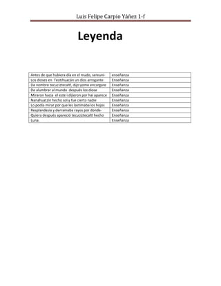 Los dioses se reunieron en Teotihuacán para decidir quién iluminaría el mundo. Un dios arrogante llamado Tecuciztecatl dijo que él se encargaría de esa tarea. Sin embargo, cuando los dioses miraron hacia el este, apareció Nanahuatzin convertido en el sol. A pesar de que su resplandor lastimaba los ojos, iluminó el mundo, mientras que Tecuciztecatl se convirtió en la luna.