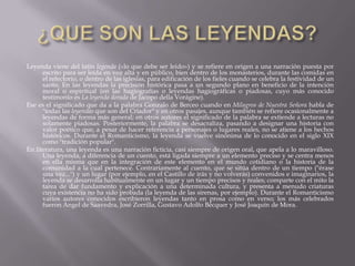 ¿QUE SON LASLEYENDAS?Leyenda viene del latín legenda («lo que debe ser leído») y se refiere en origen a una narración puesta por escrito para ser leída en voz alta y en público, bien dentro de los monasterios, durante las comidas en el refectorio, o dentro de las iglesias, para edificación de los fieles cuando se celebra la festividad de un santo. En las leyendas la precisión histórica pasa a un segundo plano en beneficio de la intención moral o espiritual (en las hagiografías o leyendas hagiográficas o piadosas, cuyo más conocido testimonio es La leyenda dorada de Jacopodella Vorágine).Ese es el significado que da a la palabra Gonzalo de Berceo cuando en Milagros de Nuestra Señora habla de "todas las leyendas que son del Criador" y en otros pasajes, aunque también se refiere ocasionalmente a leyendas de forma más general; en otros autores el significado de la palabra se extiende a lecturas no solamente piadosas. Posteriormente, la palabra se desacraliza, pasando a designar una historia con valor poético que, a pesar de hacer referencia a personajes o lugares reales, no se atiene a los hechos históricos. Durante el Romanticismo, la leyenda se vuelve sinónima de lo conocido en el siglo XIX como "tradición popular".En literatura, una leyenda es una narración ficticia, casi siempre de origen oral, que apela a lo maravilloso. Una leyenda, a diferencia de un cuento, está ligada siempre a un elemento preciso y se centra menos en ella misma que en la integración de este elemento en el mundo cotidiano o la historia de la comunidad a la cual pertenece. Contrariamente al cuento, que se sitúa dentro de un tiempo ("érase una vez...") y un lugar (por ejemplo, en el Castillo de irás y no volverás) convenidos e imaginarios, la leyenda se desarrolla habitualmente en un lugar y un tiempo precisos y reales; comparte con el mito la tarea de dar fundamento y explicación a una determinada cultura, y presenta a menudo criaturas cuya existencia no ha sido probada (la leyenda de las sirenas, por ejemplo). Durante el Romanticismo varios autores conocidos escribieron leyendas tanto en prosa como en verso; los más celebrados fueron Ángel de Saavedra, José Zorrilla, Gustavo Adolfo Bécquer y José Joaquín de Mora.