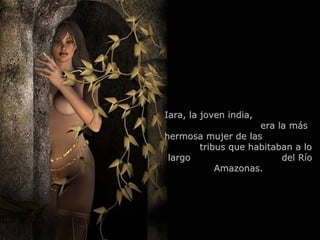 Iara era la mujer más hermosa entre las tribus del Río Amazonas. Fue violada por hombres extraños con barbas y ropas pesadas que hablaban una lengua desconocida. Como resultado, el espíritu de las aguas la transformó en una criatura mitad mujer y mitad pez para que pudiera vivir eternamente en el río. Ahora Iara puede comunicarse con los pájaros, peces y atraer a los hombres con su canto de sirena.