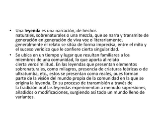 Una leyenda es una narración que se transmite de generación en generación, generalmente ubicada en un tiempo y lugar familiares a una comunidad. Puede incluir elementos sobrenaturales que la comunidad considera reales. A través del tiempo, las leyendas experimentan cambios a medida que se transmiten oralmente. Algunas leyendas intentan explicar fenómenos naturales, eventos sociales o religiosos con un lenguaje simple. Proporcionan información sobre la cultura de un pueblo.