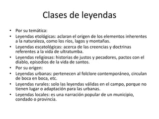 Una leyenda es una narración de hechos naturales, sobrenaturales o una mezcla de ambos que se transmite de generación en generación. Las leyendas se dividen en categorías como etiológicas, escatológicas, religiosas, urbanas y rurales. Contienen un núcleo histórico ampliado con detalles imaginativos y a menudo se agrupan en torno a personajes famosos.
