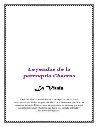 Este documento presenta tres leyendas de la parroquia de Chacras en Ecuador. La primera leyenda trata sobre "La Viuda", el espíritu de una mujer joven asesinada que se aparece por las noches en busca de venganza. La segunda leyenda se refiere a "La loma del diablo", un terreno aislado y tenebroso donde se dice que aparece el diablo. La tercera leyenda narra el encuentro de un ganadero con un hombre misterioso de manos peludas, a quien luego identifica