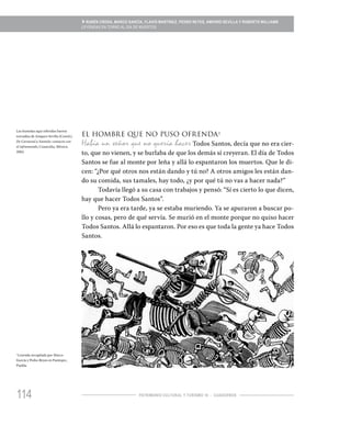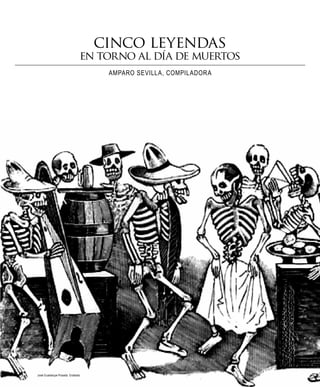 Este documento presenta cinco leyendas mexicanas relacionadas con el Día de Muertos. La primera cuenta la historia de un hombre que no creía en el Día de Muertos y no ofreció ofrendas, por lo que fue asustado por los muertos en el bosque. La segunda narra la historia de un hombre que no respetó el Día de Difuntos y trabajó en su parcela, escuchando luego las voces de sus familiares fallecidos. La tercera es sobre un hombre que también no creía y trabajó ese día, viendo después a