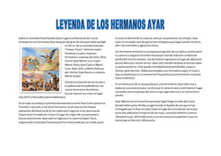 2) El dios Inti envió a su hijo Ayar Manco y su hermana Mama Ocllo para que civilizaran a estas poblaciones y fundaran un imperio.