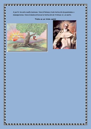 El documento describe un sueño que tuvo San Pedro Nolasco, fundador de la Orden Mercedaria, en el que veía un gran olivo que representaba la Iglesia siendo atacado. A pesar de los esfuerzos por destruirlo, cada rama cortada daba lugar a nuevos brotes, mostrando que las fuerzas del mal no podrían vencer a la Iglesia. Este sueño le dio a Nolasco la esperanza y determinación para continuar su obra de rescatar esclavos cristianos sin desanimarse ante las dificultades.