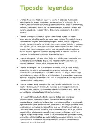 El documento describe diferentes tipos de leyendas, incluyendo leyendas teogónicas sobre el origen de los dioses, leyendas cosmogónicas sobre la creación del mundo, leyendas etiológicas sobre el origen de cosas, y leyendas histórico-culturales. Luego, discute evidencia que sugiere que la cultura griega tuvo sus orígenes en Egipto, incluyendo que filósofos griegos como Platón y Pitágoras estudiaron en Egipto y que muchos mitos griegos pueden haberse originado