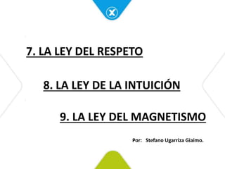 Este documento presenta tres leyes del liderazgo: la ley del respeto, la ley de la intuición y la ley del magnetismo. La ley del respeto establece que los líderes deben ganarse el respeto a través del ejemplo en lugar de dar órdenes. La ley de la intuición señala que los líderes evalúan las situaciones de forma instintiva basándose en hechos y factores intangibles. Finalmente, la ley del magnetismo indica que los líderes atraen a personas con cualidades similares a las suyas