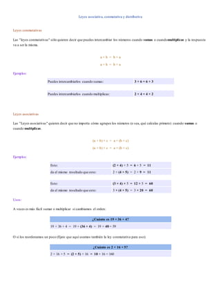 Las leyes conmutativas, asociativas y distributiva describen propiedades de las operaciones de suma y multiplicación. La ley conmutativa establece que el orden de los sumandos o factores no afecta el resultado. La ley asociativa garantiza que el agrupamiento no importa. La ley distributiva relaciona la suma y la multiplicación al distribuir un factor común sobre una suma.