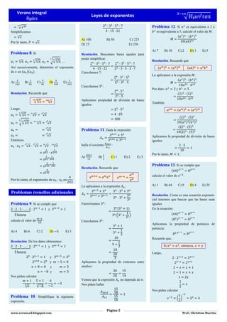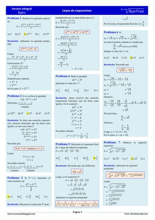 Este documento presenta una serie de problemas relacionados con exponentes y raíces. 1) Resume los principios básicos de las propiedades de exponentes como reducir expresiones elevadas a exponentes y factorizar términos. 2) Presenta una serie de ejercicios resueltos que aplican estas propiedades para simplificar expresiones y resolver ecuaciones exponenciales. 3) Los problemas cubren temas como reducir expresiones, determinar valores numéricos, calcular exponentes finales y simplificar expresiones complejas con raíces y exponentes.