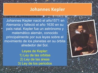 Johannes Kepler descubrió tres leyes fundamentales sobre el movimiento de los planetas alrededor del Sol. La primera ley establece que las órbitas planetarias son elípticas con el Sol en uno de los focos. La segunda ley indica que las áreas barridas por un planeta en tiempos iguales son iguales. Y la tercera ley señala que el cuadrado del periodo orbital de un planeta es directamente proporcional al cubo de la distancia media del planeta al Sol. Estas leyes revolucionaron la astronomía.