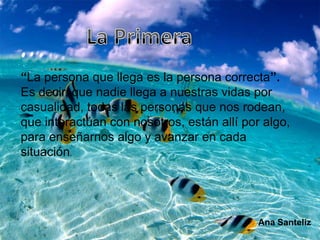 El documento resume la filosofía de que todas las personas que llegan a nuestras vidas lo hacen por una razón, ya sea para enseñarnos una lección o ayudarnos a avanzar. También argumenta que todos los eventos que ocurren son perfectos y están destinados a suceder exactamente como sucedieron, y que los comienzos y finales ocurren en el momento preciso. Finalmente, enfatiza que ningún mensaje llega a nuestras vidas por casualidad y que debemos vivir con amor.