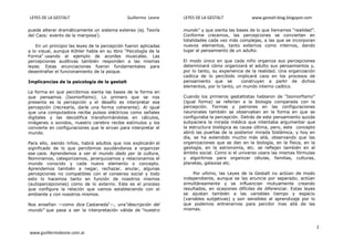 El documento describe las Leyes de la Gestalt, principios psicológicos enunciados a principios del siglo XX por psicólogos alemanes sobre cómo el cerebro organiza la percepción. Las leyes incluyen la figura y el fondo, la buena forma, y el cierre. Explican cómo el cerebro transforma los estímulos en configuraciones coherentes y totalidades, prefiriendo formas simples, completas y estables. Estas leyes influyen en cómo organizamos el pensamiento y experimentamos la realidad.