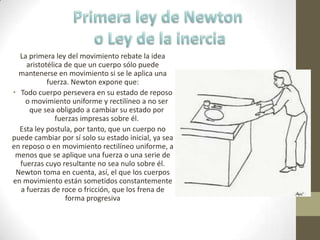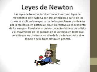 Las tres leyes de Newton explican el movimiento de los cuerpos y constituyen los fundamentos de la física clásica. La primera ley establece que un cuerpo permanece en reposo o movimiento uniforme a menos que una fuerza externa actúe sobre él. La segunda ley explica que la aceleración de un cuerpo es directamente proporcional a la fuerza aplicada y la tercera ley establece que por cada fuerza de interacción entre dos cuerpos, estos ejercen fuerzas iguales y opuestas entre sí.