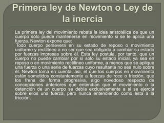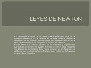 Las tres leyes de Newton explican el movimiento de los cuerpos y la dinámica. La primera ley establece que un cuerpo permanece en reposo o movimiento uniforme a menos que se aplique una fuerza externa. La segunda ley indica que la fuerza aplicada causa una aceleración proporcional a la fuerza y a la masa del cuerpo. La tercera ley expone que por cada fuerza de interacción hay una igual y opuesta: a toda acción le corresponde una reacción igual.