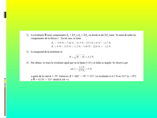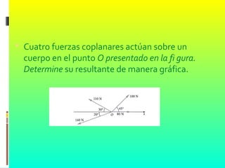 El documento aborda diferentes problemas de física relacionados con fuerzas coplanares que actúan sobre objetos. Incluye cálculos de componentes de fuerzas, tensión en cuerdas, aceleraciones y coeficientes de fricción, presentando soluciones gráficas y numéricas. Se presentan diversas situaciones que ilustran la aplicación de principios de dinámica en objetos con distintas masas y fuerzas aplicadas.