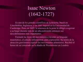 Isaac Newton formuló las tres leyes del movimiento tras realizar descubrimientos importantes durante un año fuera de la universidad debido a la peste. Sus leyes explican que un objeto permanece en movimiento a menos que actúe una fuerza sobre él, y que la fuerza y aceleración de un objeto están directamente relacionadas a su masa. Newton también desarrolló el cálculo infinitesimal para expresar matemáticamente sus leyes del movimiento y la gravitación.
