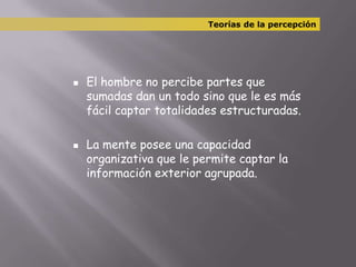 El documento describe las teorías de la percepción y las leyes de la organización perceptual. Explica que la mente tiene una capacidad organizativa que le permite captar la información exterior de forma estructurada en totalidades en lugar de partes aisladas. Luego enumera varias leyes como la figura-fondo, semejanza, proximidad, cierre, pregnancia, anomalía y continuidad, las cuales guían la forma en que la mente agrupa y organiza los estímulos externos.