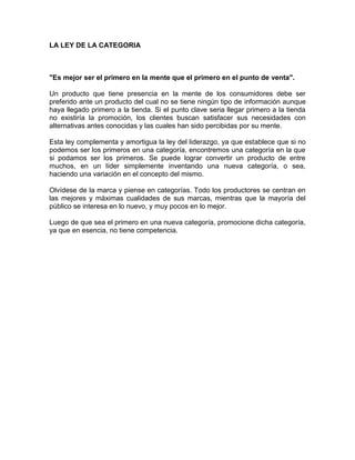 La ley de la exclusividad establece que una empresa debe asumir la posición que ocupa en la mente del cliente y diseñar su estrategia en consecuencia. Cuando un competidor se ha apoderado de un concepto en la mente del cliente, es inútil que otra empresa trate de apropiarse del mismo. Muchas empresas han violado esta ley al tratar de reemplazar conceptos ya establecidos, lo que suele reforzar la posición del competidor.