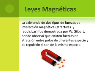 El documento resume varias leyes y descubrimientos clave relacionados con el magnetismo. Entre ellos se encuentran la demostración de W. Gilbert de las fuerzas magnéticas de atracción y repulsión, el establecimiento por Coulomb de la Ley de los polos magnéticos, y las cuatro ecuaciones de Maxwell que demuestran las leyes magnéticas. También se menciona el descubrimiento de Faraday en 1831 de la inducción electromagnética.