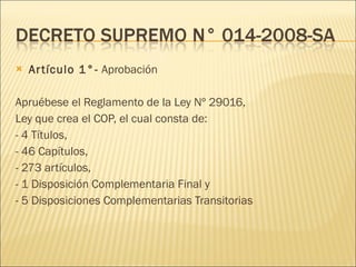 El documento aprueba el reglamento de la Ley No 29016 que crea el Colegio Odontológico del Perú (COP). El reglamento consta de 4 títulos, 46 capítulos y 273 artículos. Se deroga el Decreto Supremo No 280-65-DGS. El Ministro de Salud refrenda el reglamento.