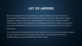 Este documento resume varias leyes fundamentales de la física relacionadas con el magnetismo. Explica la Ley de Ampere, que relaciona el campo magnético con las corrientes eléctricas que lo producen. También describe la Ley de Faraday sobre la inducción electromagnética y la Ley de Lenz sobre la polaridad de las tensiones inducidas. Finalmente, incluye preguntas sobre el campo magnético y las propiedades de los imanes.