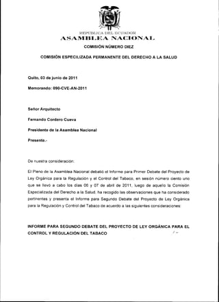 Este documento presenta el informe para segundo debate del Proyecto de Ley Orgánica para la Regulación y Control del Tabaco aprobado por la Comisión Especializada Permanente del Derecho a la Salud. El informe explica las modificaciones realizadas al proyecto de ley luego del primer debate, incluyendo cambios al título, la inclusión de un capítulo sobre educación para la prevención, y modificaciones a las definiciones y sanciones. La Comisión recomienda que la Asamblea Nacional apruebe el proyecto de ley para su