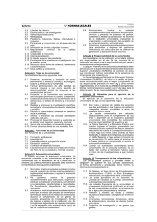 Este documento establece las disposiciones generales de la Ley Universitaria en Perú. Define la universidad y sus principios, fines y funciones. Establece la Superintendencia Nacional de Educación Superior Universitaria (SUNEDU) como organismo responsable de licenciar y supervisar la calidad de la educación superior universitaria. También regula aspectos como la autonomía universitaria, la transparencia y responsabilidad de las autoridades universitarias.