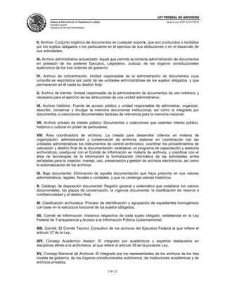 La ley federal de archivos establece las disposiciones para la organización y conservación de archivos en poder de los poderes de la unión, organismos constitucionales autónomos y organismos con autonomía legal. Define términos clave como archivo, documento de archivo, archivo histórico y patrimonio documental de la nación. Establece que el objetivo es preservar los documentos que son parte del patrimonio documental de México y hacerlos accesibles al público.