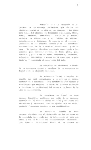 Este documento contiene un oficio del Congreso Nacional de Chile a la Presidenta de la República solicitando si hará uso de su facultad de aprobar sin observaciones un proyecto de ley general de educación. Adjunta el proyecto de ley que establece los principios, derechos, deberes y organización del sistema educativo chileno. El proyecto contiene 10 artículos preliminares que definen conceptos básicos y principios como calidad, equidad, autonomía, diversidad e integración del sistema educativo.