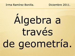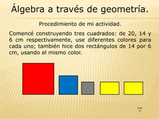 La autora construyó cuadrados y rectángulos de diferentes tamaños utilizando letras para representar los lados. Calculó el área de cada figura y ordenó las figuras pequeñas dentro de un cuadrado grande. Observó que el área del cuadrado grande era igual a la suma de las áreas de las figuras pequeñas. A partir de esto, desarrolló una ecuación que muestra que el cuadrado de una suma es igual a la suma de los cuadrados más el doble del producto de los términos.
