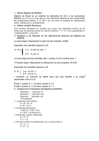 1. El álgebra de Boole es un sistema algebraico que modela las operaciones lógicas AND, OR y NOT usando los elementos 0 y 1 y los operadores +, · y '. 2. Una variable booleana solo puede tomar los valores 0 o 1, equivalentes a falso o verdadero. 3. Las operaciones básicas son la suma lógica OR, el producto lógico AND y la negación NOT, con ejemplos de sus tablas de verdad.