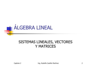 El documento presenta un resumen de los conceptos fundamentales de álgebra lineal, incluyendo sistemas lineales, vectores, matrices y su aplicación para resolver sistemas de ecuaciones lineales a través del método de eliminación de Gauss. Se definen conceptos como sistemas lineales, matrices de coeficientes, vectores de constantes, matrices aumentadas y formas escalonada y reducida escalonada. También se explica el proceso de eliminación de Gauss para reducir una matriz a su forma escalonada y así resolver sistemas de ecuaciones lineales.