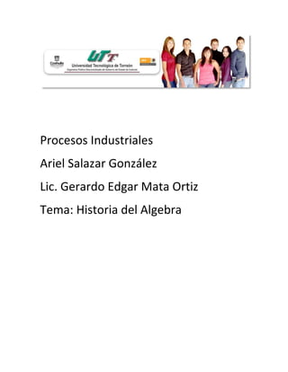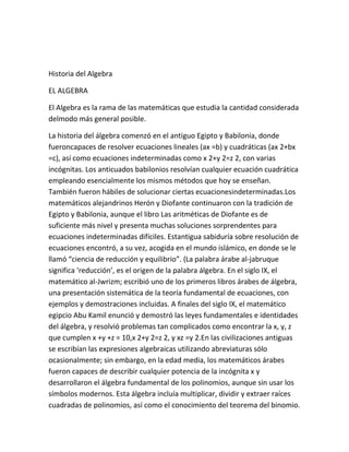 El documento resume la historia del álgebra desde su origen en el antiguo Egipto y Babilonia hasta su desarrollo en la edad media por matemáticos árabes como Al-Jwarizmi y el uso de símbolos algebraicas modernos en el siglo XVI y XVII por matemáticos europeos como Descartes. Destaca que los antiguos egipcios y babilonios resolvían ecuaciones lineales y cuadráticas, mientras que matemáticos griegos como Diofanto introdujeron el álgebra como una disciplina rigurosa y los