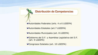 Este documento presenta un resumen de la Ley General del Equilibrio Ecológico y la Protección al Ambiente (LGEEPA) de México. La LGEEPA establece las bases de la política ambiental nacional y distribuye las competencias entre la federación, los estados y los municipios en materia de preservación del equilibrio ecológico y protección ambiental. También define instrumentos como la planeación ambiental, el ordenamiento ecológico, las evaluaciones de impacto ambiental y las normas oficiales mexicanas para regular las actividades que